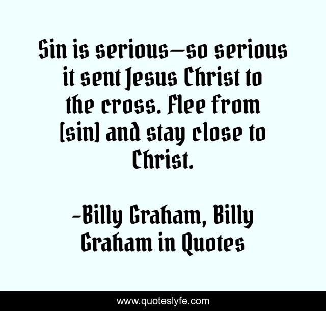 This page presents the quote "Sin is serious—so serious it sent Jesus Christ to the cross. Flee from [sin] and stay close to Christ.". Author of this quote is Billy Graham, Billy Graham in Quotes. This quote is about jesus-christ, billy-graham, sin, cross,.