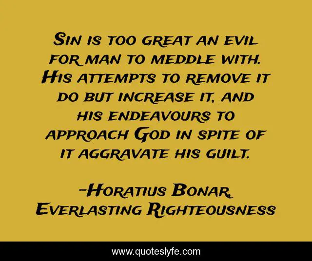 This page presents the quote "Sin is too great an evil for man to meddle with. His attempts to remove it do but increase it, and his endeavours to approach God in spite of it aggravate his guilt.". Author of this quote is Horatius Bonar, Everlasting Righteousness. This quote is about sin, christianity,.