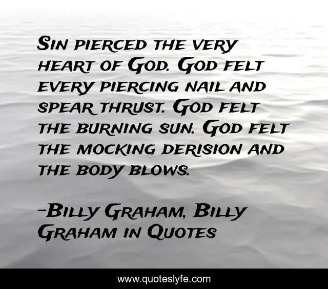 This page presents the quote "Sin pierced the very heart of God. God felt every piercing nail and spear thrust. God felt the burning sun. God felt the mocking derision and the body blows.". Author of this quote is Billy Graham, Billy Graham in Quotes. This quote is about billy-graham, piercing-nail, sin, spear, heart-of-god,.