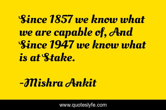 This page presents the quote "Since 1857 we know what we are capable of, And Since 1947 we know what is at Stake.". Author of this quote is Mishra Ankit. This quote is about 1947, independence,.