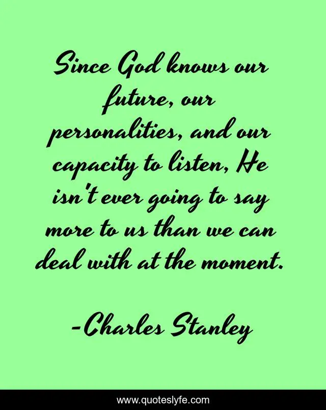 This page presents the quote "Since God knows our future, our personalities, and our capacity to listen, He isn't ever going to say more to us than we can deal with at the moment.". Author of this quote is Charles Stanley. This quote is about moment, future, listen,.