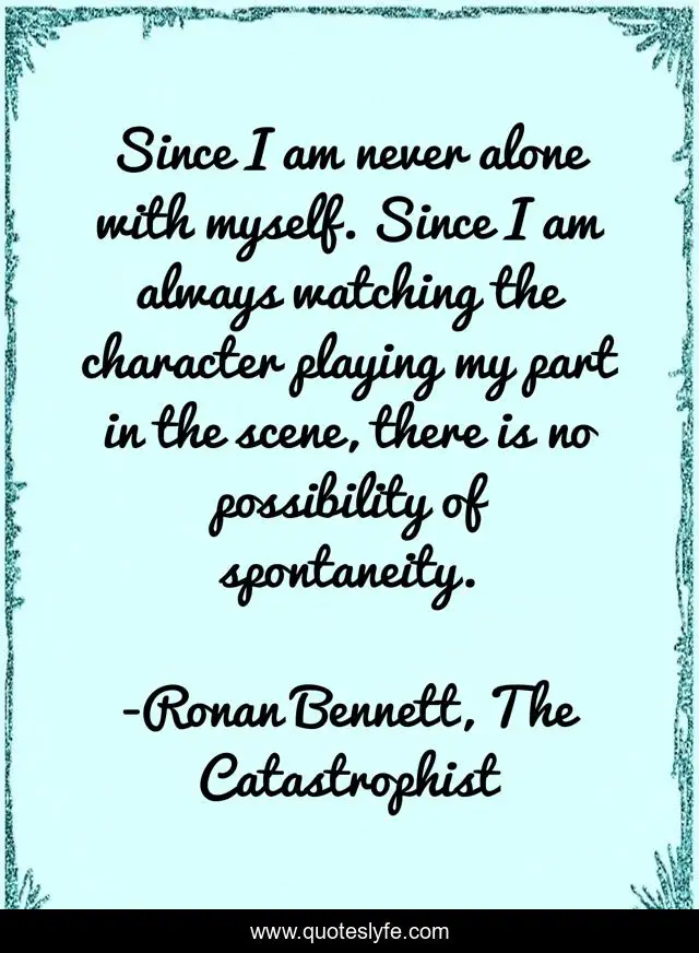 This page presents the quote "Since I am never alone with myself. Since I am always watching the character playing my part in the scene, there is no possibility of spontaneity.". Author of this quote is Ronan Bennett, The Catastrophist. This quote is about self, watching, character, writing,.