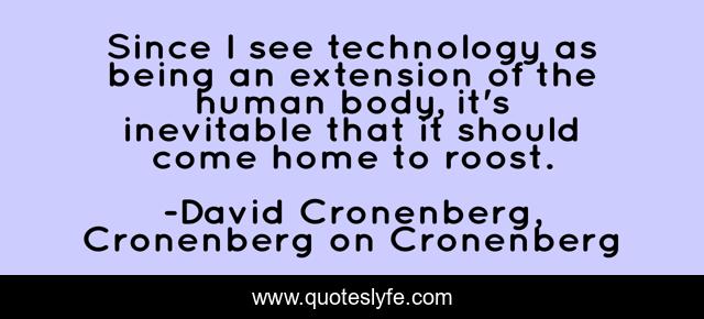This page presents the quote "Since I see technology as being an extension of the human body, it's inevitable that it should come home to roost.". Author of this quote is David Cronenberg, Cronenberg on Cronenberg. This quote is about philosophy, technology, film,.