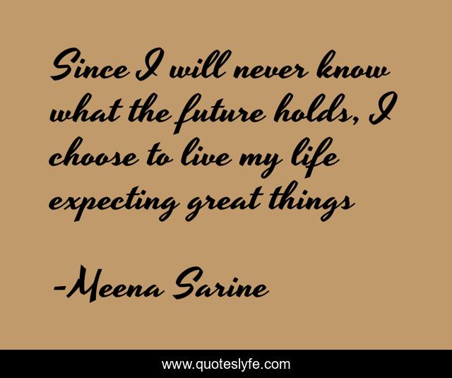 This page presents the quote "Since I will never know what the future holds, I choose to live my life expecting great things". Author of this quote is Meena Sarine. This quote is about confidence, positive, expectations, behaviour, attitude, life-and-living, tomorrow, hope, inspiration,.