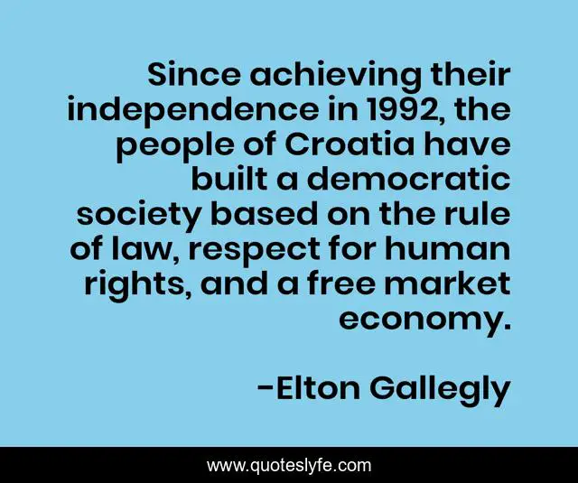 This page presents the quote "Since achieving their independence in 1992, the people of Croatia have built a democratic society based on the rule of law, respect for human rights, and a free market economy.". Author of this quote is Elton Gallegly. This quote is about respect, law, society,.