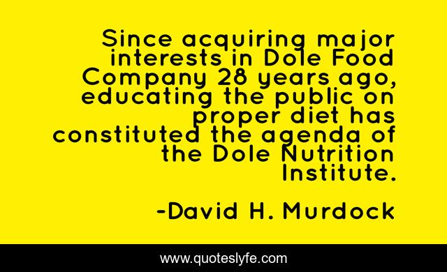 This page presents the quote "Since acquiring major interests in Dole Food Company 28 years ago, educating the public on proper diet has constituted the agenda of the Dole Nutrition Institute.". Author of this quote is David H. Murdock. This quote is about food, nutrition, company,.