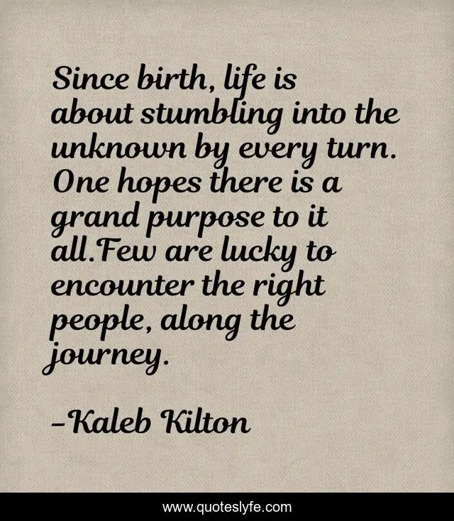This page presents the quote "Since birth, life is about stumbling into the unknown by every turn. One hopes there is a grand purpose to it all.Few are lucky to encounter the right people, along the journey.". Author of this quote is Kaleb Kilton. This quote is about journey, birth, hope, right-people, lucky,.
