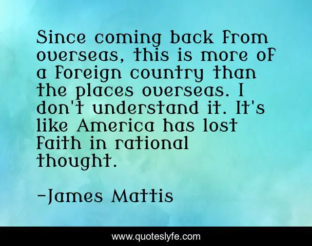 This page presents the quote "Since coming back from overseas, this is more of a foreign country than the places overseas. I don't understand it. It's like America has lost faith in rational thought.". Author of this quote is James Mattis. This quote is about thought, america, lost,.