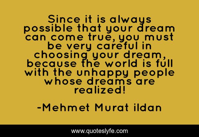This page presents the quote "Since it is always possible that your dream can come true, you must be very careful in choosing your dream, because the world is full with the unhappy people whose dreams are realized!". Author of this quote is Mehmet Murat ildan. .