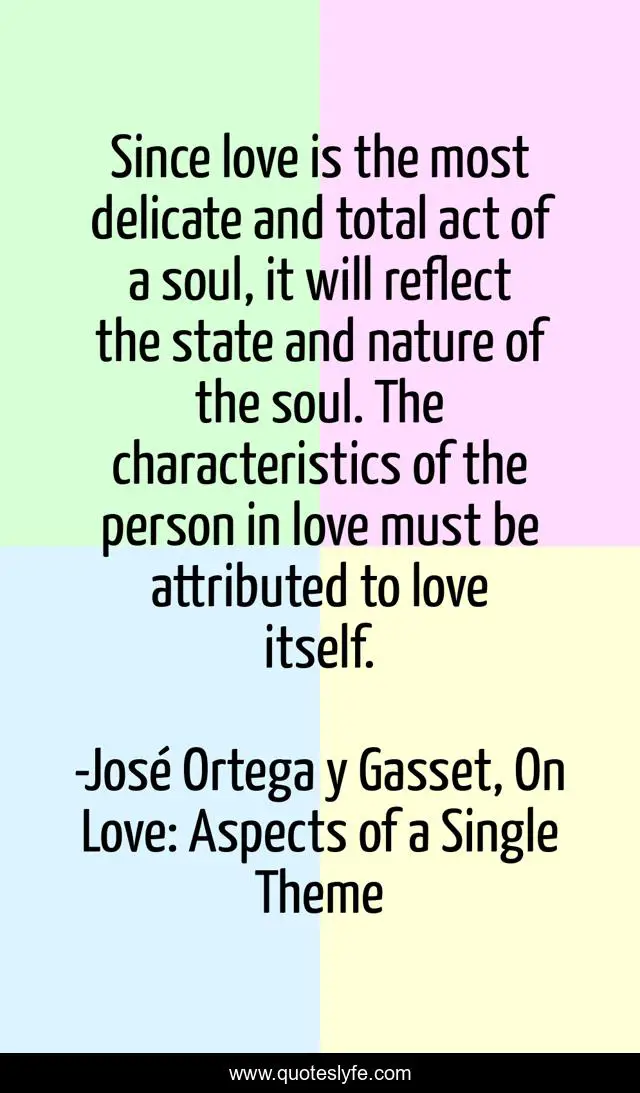 This page presents the quote "Since love is the most delicate and total act of a soul, it will reflect the state and nature of the soul. The characteristics of the person in love must be attributed to love itself.". Author of this quote is José Ortega y Gasset, On Love: Aspects of a Single Theme. This quote is about characteristics, love, soul, affection, nature,.