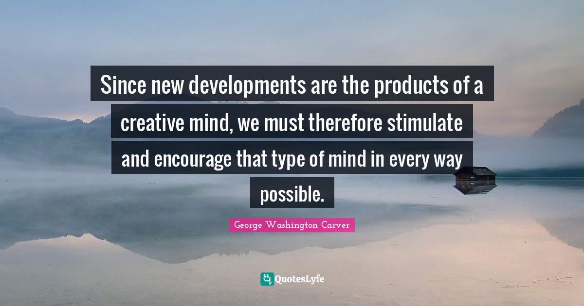 This page presents the quote "Since new developments are the products of a creative mind, we must therefore stimulate and encourage that type of mind in every way possible.". Author of this quote is George Washington Carver. This quote is about creative, courage, type, way, products, mind, creative mind, creativity,.