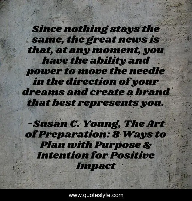 This page presents the quote "Since nothing stays the same, the great news is that, at any moment, you have the ability and power to move the needle in the direction of your dreams and create a brand that best represents you.". Author of this quote is Susan C. Young, The Art of Preparation: 8 Ways to Plan with Purpose & Intention for Positive Impact. This quote is about success, relationship, communication-skills, branding, attitude, behaviour, quotes-by-susan-c-young, susan-young, motivational-speaker,.