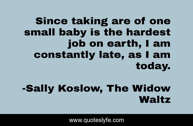 This page presents the quote "Since taking are of one small baby is the hardest job on earth, I am constantly late, as I am today.". Author of this quote is Sally Koslow, The Widow Waltz. This quote is about baby, parenting,.