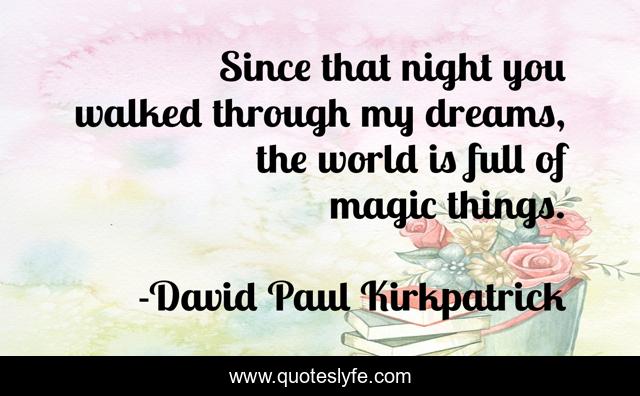 This page presents the quote "Since that night you walked through my dreams, the world is full of magic things.". Author of this quote is David Paul Kirkpatrick. This quote is about love, merlin, magic, affection,.