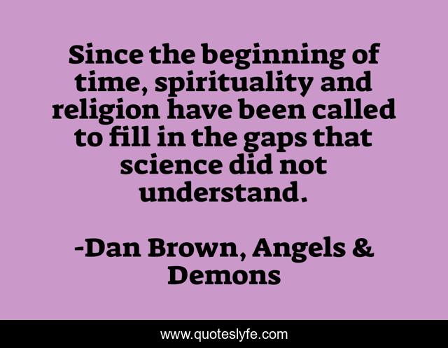This page presents the quote "Since the beginning of time, spirituality and religion have been called to fill in the gaps that science did not understand.". Author of this quote is Dan Brown, Angels & Demons. This quote is about faith, angels-and-demons, religion, science, spirituality, dan-brown,.