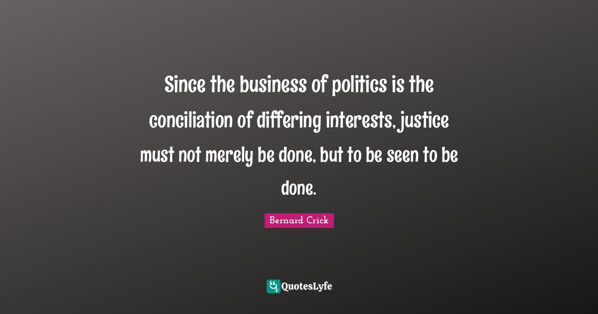 This page presents the quote "Since the business of politics is the conciliation of differing interests, justice must not merely be done, but to be seen to be done.". Author of this quote is Bernard Crick. This quote is about justice, politics, interest, business, done,.
