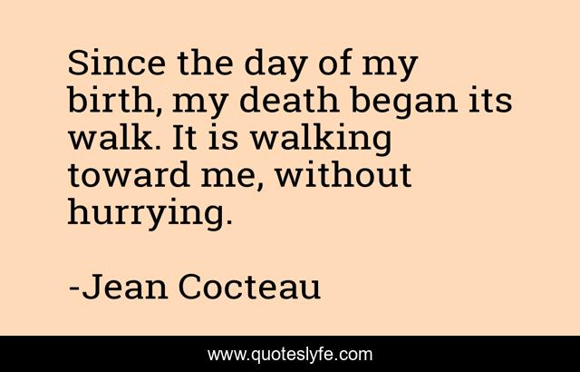 This page presents the quote "Since the day of my birth, my death began its walk. It is walking toward me, without hurrying.". Author of this quote is Jean Cocteau. This quote is about walking, day, walk,.