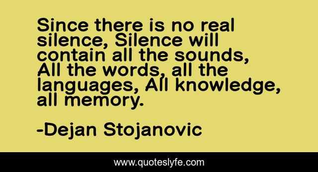This page presents the quote "Since there is no real silence, Silence will contain all the sounds, All the words, all the languages, All knowledge, all memory.". Author of this quote is Dejan Stojanovic. This quote is about real, literature, knowledge, dejan-stojanovic, poetry, wisdom, languages, quotes, silence,.