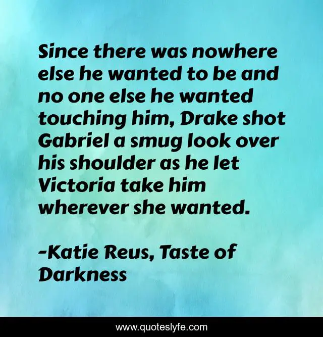 This page presents the quote "Since there was nowhere else he wanted to be and no one else he wanted touching him, Drake shot Gabriel a smug look over his shoulder as he let Victoria take him wherever she wanted.". Author of this quote is Katie Reus, Taste of Darkness. This quote is about werewolves, urban-fantasy-romance, paranormal-romance, dragons,.