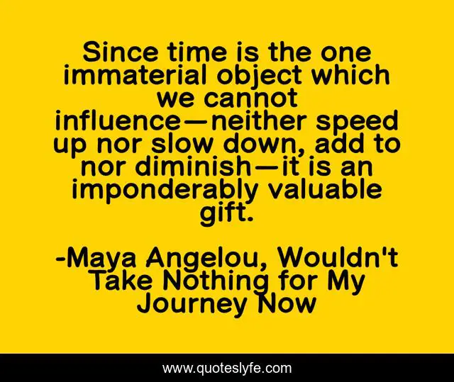 This page presents the quote "Since time is the one immaterial object which we cannot influence—neither speed up nor slow down, add to nor diminish—it is an imponderably valuable gift.". Author of this quote is Maya Angelou, Wouldn't Take Nothing for My Journey Now. This quote is about 1993, time,.
