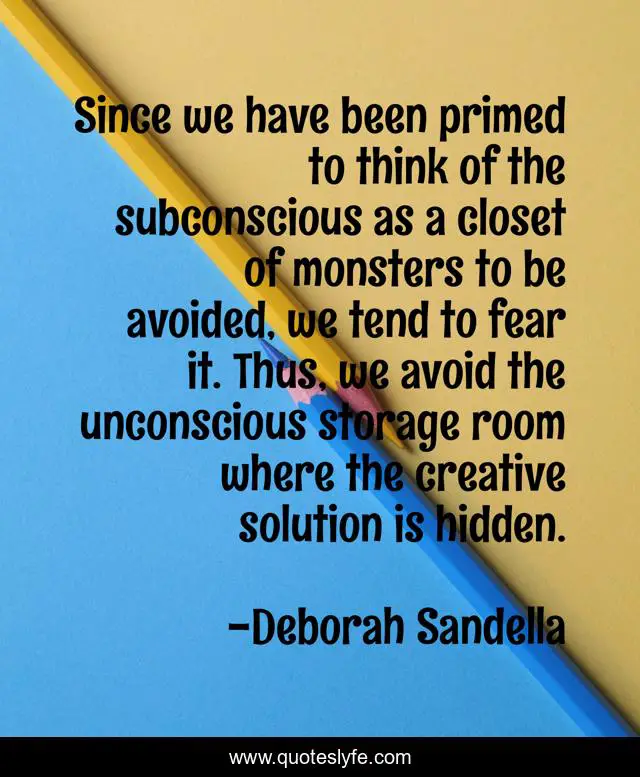 This page presents the quote "Since we have been primed to think of the subconscious as a closet of monsters to be avoided, we tend to fear it. Thus, we avoid the unconscious storage room where the creative solution is hidden.". Author of this quote is Deborah Sandella. This quote is about self-awareness, fear, transformational, subcouscious,.
