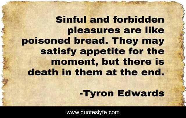This page presents the quote "Sinful and forbidden pleasures are like poisoned bread. They may satisfy appetite for the moment, but there is death in them at the end.". Author of this quote is Tyron Edwards. This quote is about death, end, forbidden, poison, moment, pleasure, appetite, sin, bread,.