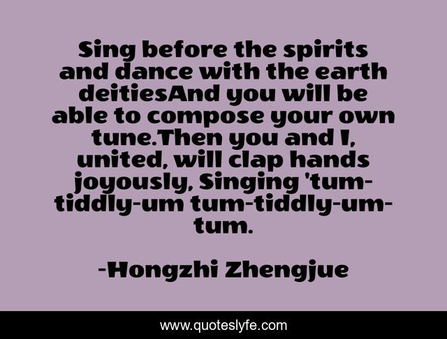 This page presents the quote "Sing before the spirits and dance with the earth deitiesAnd you will be able to compose your own tune.Then you and I, united, will clap hands joyously, Singing 'tum-tiddly-um tum-tiddly-um-tum.". Author of this quote is Hongzhi Zhengjue. This quote is about dancing, dance, joy, buddhist, zen, song, singing,.
