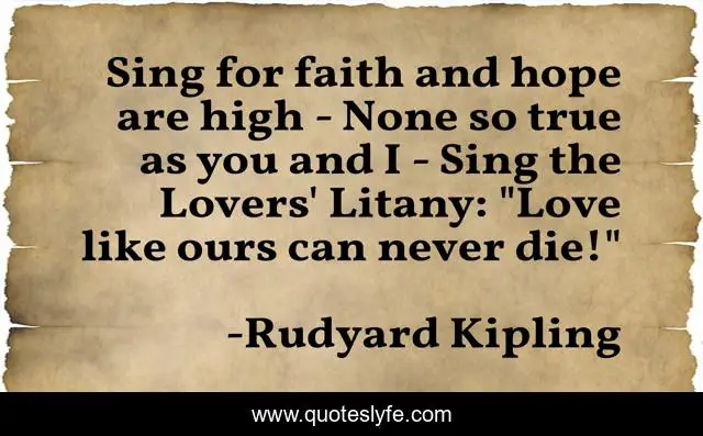 This page presents the quote "Sing for faith and hope are high - None so true as you and I - Sing the Lovers' Litany: "Love like ours can never die!"". Author of this quote is Rudyard Kipling. This quote is about love, affection,.
