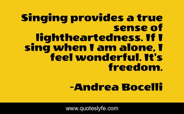 This page presents the quote "Singing provides a true sense of lightheartedness. If I sing when I am alone, I feel wonderful. It's freedom.". Author of this quote is Andrea Bocelli. This quote is about freedom, singing,.