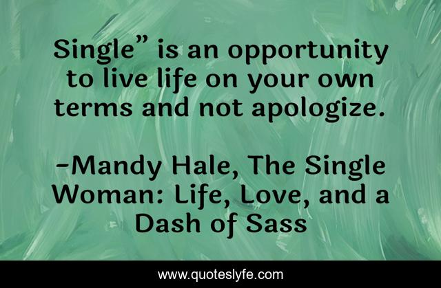 This page presents the quote "Single” is an opportunity to live life on your own terms and not apologize.". Author of this quote is Mandy Hale, The Single Woman: Life, Love, and a Dash of Sass. This quote is about single-life, confidence, no-apologies, single-woman, singleness, not-settling, holding-out-for-the-best, the-single-woman, life,.