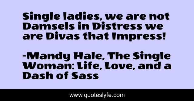 This page presents the quote "Single ladies, we are not Damsels in Distress…we are Divas that Impress!". Author of this quote is Mandy Hale, The Single Woman: Life, Love, and a Dash of Sass. This quote is about single-life, single-woman, the-single-woman, divas, damsels-in-distress, being-single, positive-thinking, single, single-ladies,.