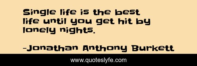 This page presents the quote "Single life is the best life until you get hit by lonely nights.". Author of this quote is Jonathan Anthony Burkett. This quote is about relationships, life, lonely, love, motivation, single, quotes-on-life, 2013, truth,.