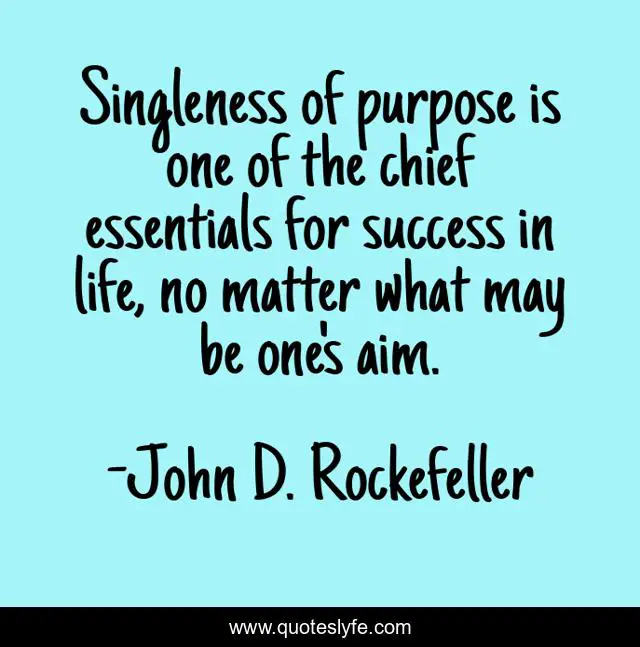 This page presents the quote "Singleness of purpose is one of the chief essentials for success in life, no matter what may be one's aim.". Author of this quote is John D. Rockefeller. This quote is about life, purpose, success,.