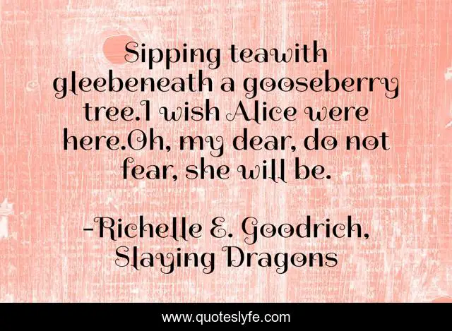 This page presents the quote "Sipping teawith gleebeneath a gooseberry tree.I wish Alice were here.Oh, my dear, do not fear, she will be.". Author of this quote is Richelle E. Goodrich, Slaying Dragons. This quote is about poem, sipping-tea, richelle-e-goodrich, poetry, alice, richelle, richelle-goodrich,.