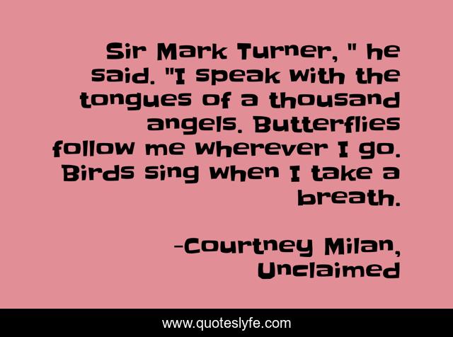 This page presents the quote "Sir Mark Turner, " he said. "I speak with the tongues of a thousand angels. Butterflies follow me wherever I go. Birds sing when I take a breath.". Author of this quote is Courtney Milan, Unclaimed. This quote is about humor, historical-romance, sarcasm, romance, unclaimed, love, affection,.