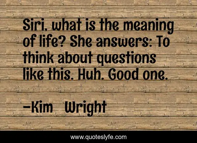 This page presents the quote "Siri, what is the meaning of life? She answers: To think about questions like this. Huh. Good one.". Author of this quote is Kim Wright. This quote is about meaning-of-life, technology, questioning,.