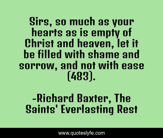 This page presents the quote "Sirs, so much as your hearts as is empty of Christ and heaven, let it be filled with shame and sorrow, and not with ease (483).". Author of this quote is Richard Baxter, The Saints' Everlasting Rest. This quote is about heart, comfort, hardness,.