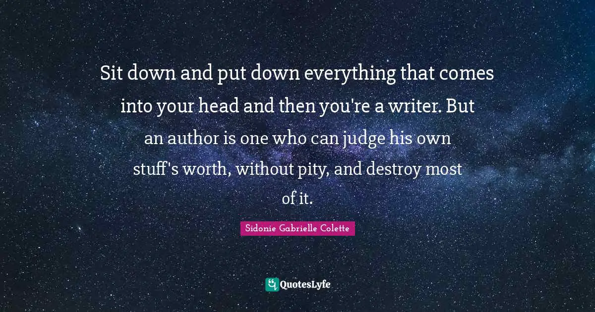 This page presents the quote "Sit down and put down everything that comes into your head and then you're a writer. But an author is one who can judge his own stuff's worth, without pity, and destroy most of it.". Author of this quote is Sidonie Gabrielle Colette. This quote is about writing, stuff, judging, pity, down and,.