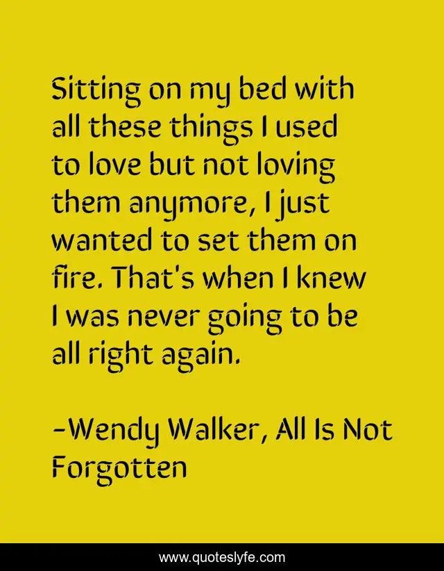 This page presents the quote "Sitting on my bed with all these things I used to love but not loving them anymore, I just wanted to set them on fire. That's when I knew I was never going to be all right again.". Author of this quote is Wendy Walker, All Is Not Forgotten. This quote is about loss, pain, wendy-walker, all-is-not-forgotten, grief, sadness, trauma, rape,.