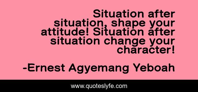 This page presents the quote "Situation after situation, shape your attitude! Situation after situation change your character!". Author of this quote is Ernest Agyemang Yeboah. This quote is about character, grow-up, emotions-and-attitude,.