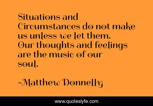 This page presents the quote "Situations and Circumstances do not make us unless we let them. Our thoughts and feelings are the music of our soul.". Author of this quote is Matthew Donnelly. This quote is about personal-growth, self-development, self-improvement, inspirational, self-help, personal-development, enthusiasm,.