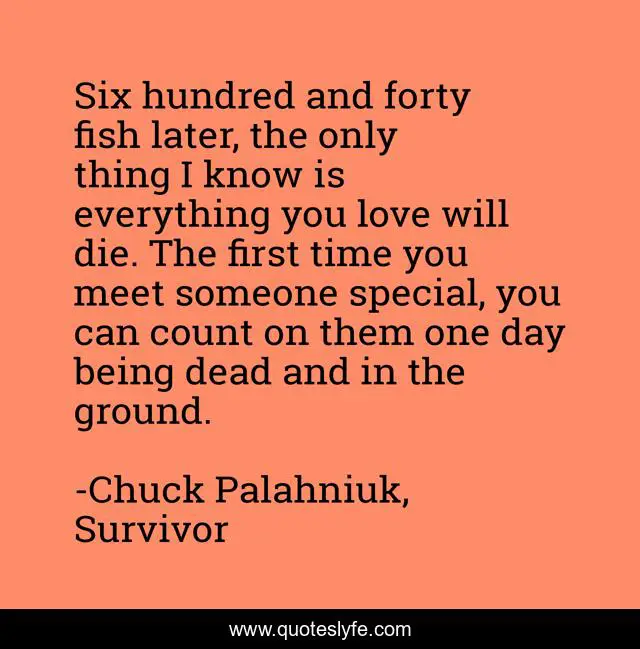 This page presents the quote "Six hundred and forty fish later, the only thing I know is everything you love will die. The first time you meet someone special, you can count on them one day being dead and in the ground.". Author of this quote is Chuck Palahniuk, Survivor. This quote is about relationships, life, death, love, affection,.