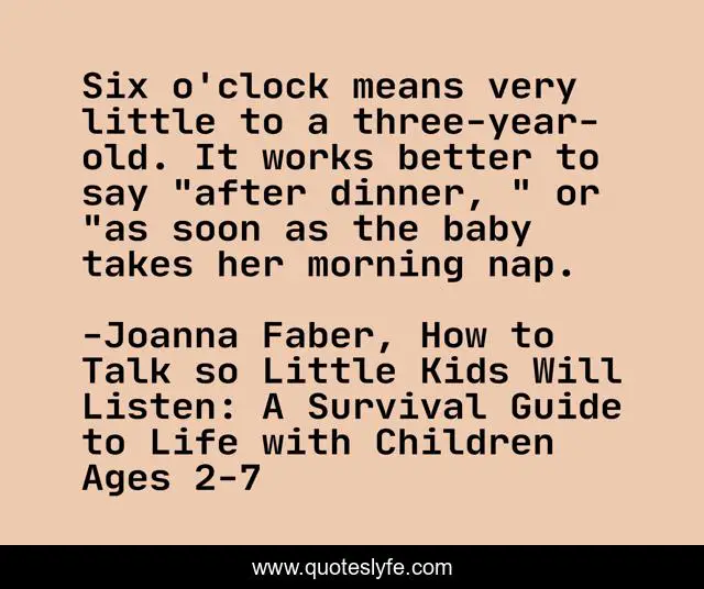 "Joanna Faber, How to Talk so Little Kids Will Listen: A Survival Guide to Life with Children Ages 2-7 Quotes." Quoteslyfe.com, 2025. Sat. 06 Dec. 2025. <https://www.quoteslyfe.com/quote/Six-o-clock-means-very-little-to-166925>.