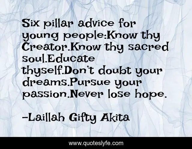 This page presents the quote "Six pillar advice for young people:Know thy Creator.Know thy sacred soul.Educate thyself.Don’t doubt your dreams.Pursue your passion.Never lose hope.". Author of this quote is Laillah Gifty Akita. This quote is about young-people, advice, motivation,.