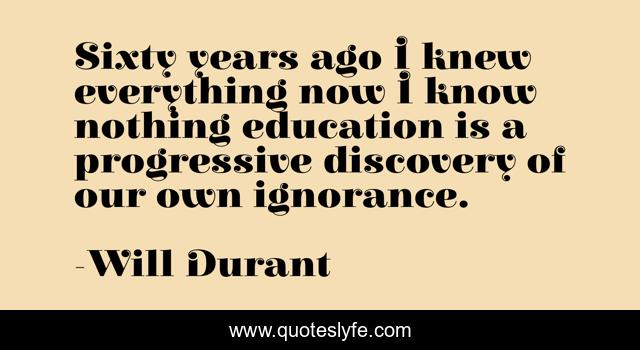 This page presents the quote "Sixty years ago I knew everything now I know nothing education is a progressive discovery of our own ignorance.". Author of this quote is Will Durant. This quote is about ignorance, discovery,.