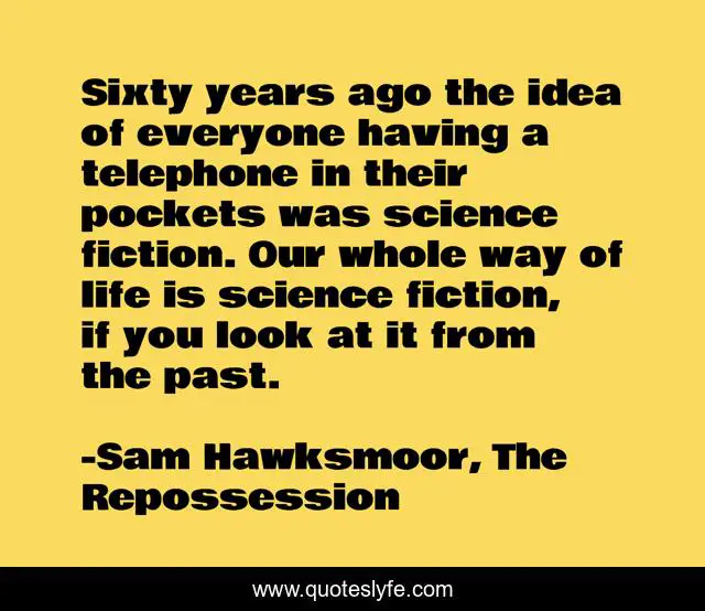 This page presents the quote "Sixty years ago the idea of everyone having a telephone in their pockets was science fiction. Our whole way of life is science fiction, if you look at it from the past.". Author of this quote is Sam Hawksmoor, The Repossession. .