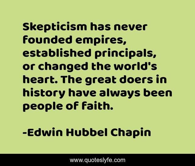 This page presents the quote "Skepticism has never founded empires, established principals, or changed the world's heart. The great doers in history have always been people of faith.". Author of this quote is Edwin Hubbel Chapin. This quote is about heart, great, history,.