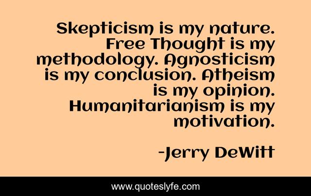 This page presents the quote "Skepticism is my nature. Free Thought is my methodology. Agnosticism is my conclusion. Atheism is my opinion. Humanitarianism is my motivation.". Author of this quote is Jerry DeWitt. This quote is about atheism, skepticism, dewitt, humanitarianism,.