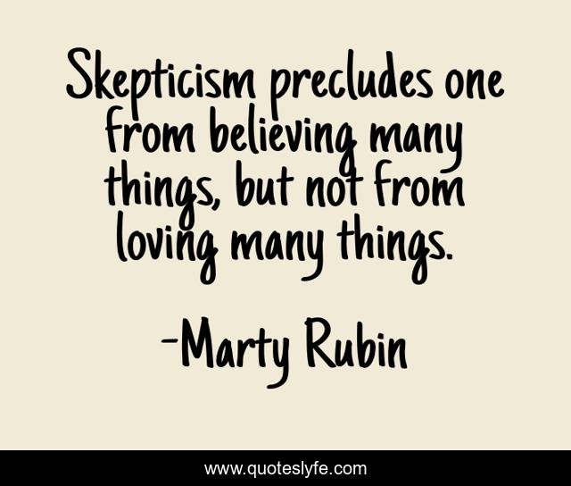 This page presents the quote "Skepticism precludes one from believing many things, but not from loving many things.". Author of this quote is Marty Rubin. This quote is about skepticism, love, belief, affection,.