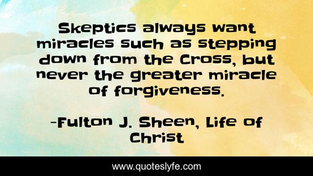 This page presents the quote "Skeptics always want miracles such as stepping down from the Cross, but never the greater miracle of forgiveness.". Author of this quote is Fulton J. Sheen, Life of Christ. This quote is about miracles, skepticism, jesus, forgiveness, the-cross,.
